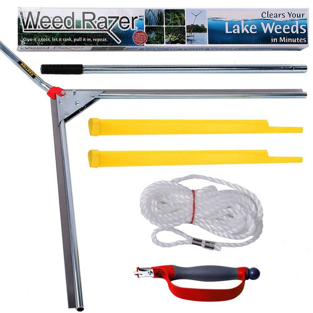 Weighing less than eight pounds, the Weed Razer is light enough so it can be thrown easily but heavy enough to sink to the bottom of your lake or pond. The Weed Razer is environmentally friendly, easy-to-use, and safe to operate. Each Weed Razer comes with lock-in-place blade covers, a sharpener and a floating rope which allows a reach of up to 30 feet from one location.